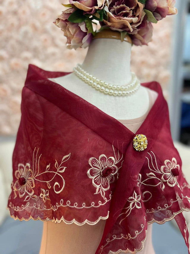 The pañuelo (from Spanish paño + -uelo) or alampay is a Filipino lace-like embroidered neck scarf or shawl worn around the shoulders over the camisa (blouse).